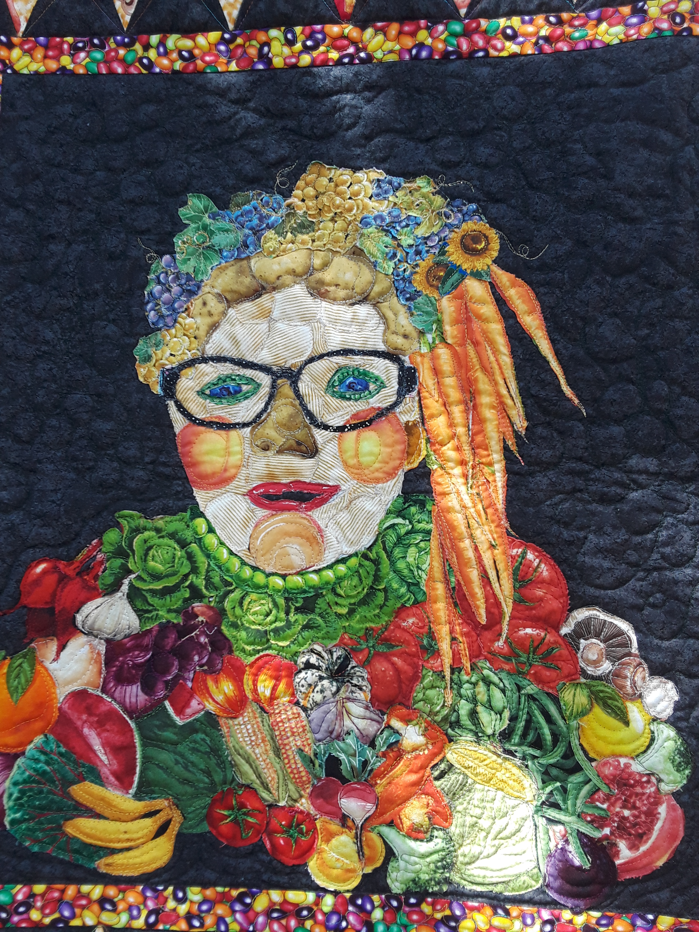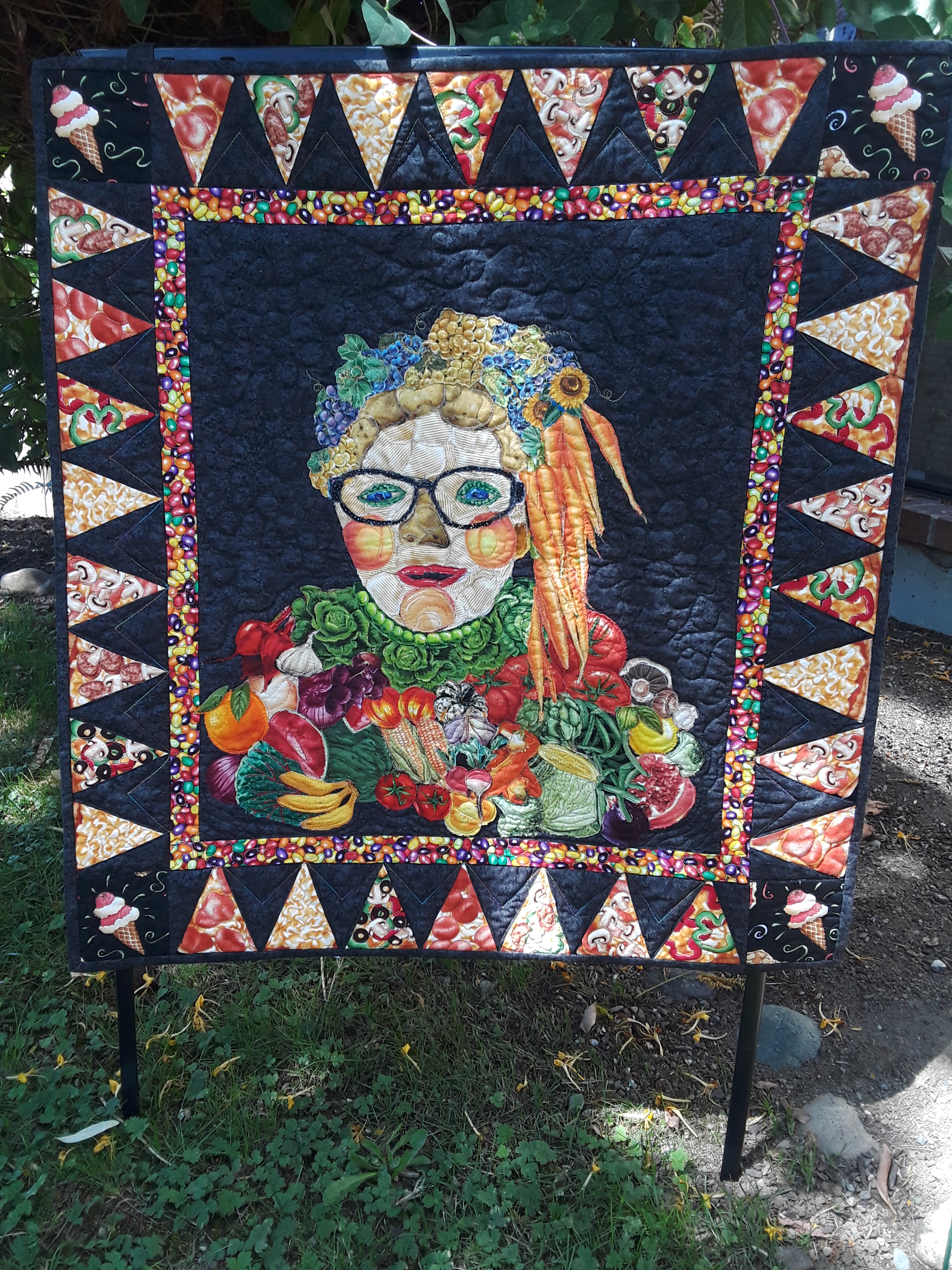 A lady made of vegetables and with a pizza border.