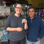 Aaron and Marco in front of the shop. You can see the display of miniatures on the right.